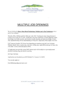 Read MoreHeavy Duty Diesel Technicians, Welders, and a Tire Technician needed full-time at S.E.G. Trucking in Concord. See flyer for more details.