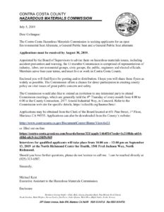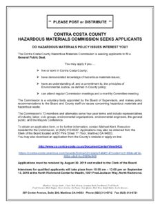 The Contra Costa Hazardous Materials Commission is seeking applications! Read the letter below to see if you qualify. If so, download an application or apply directly online by clicking here.