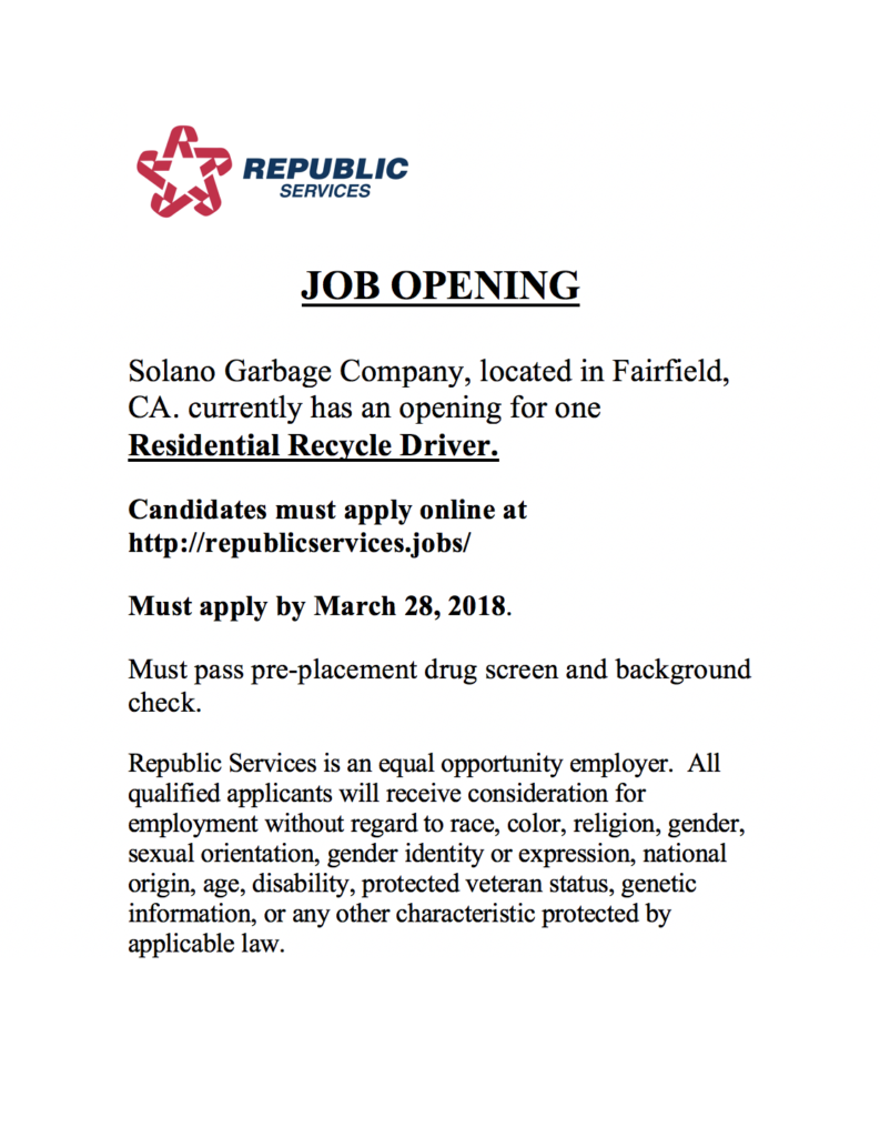 JOB OPENING: Residential Recycle Driver in Fairfield