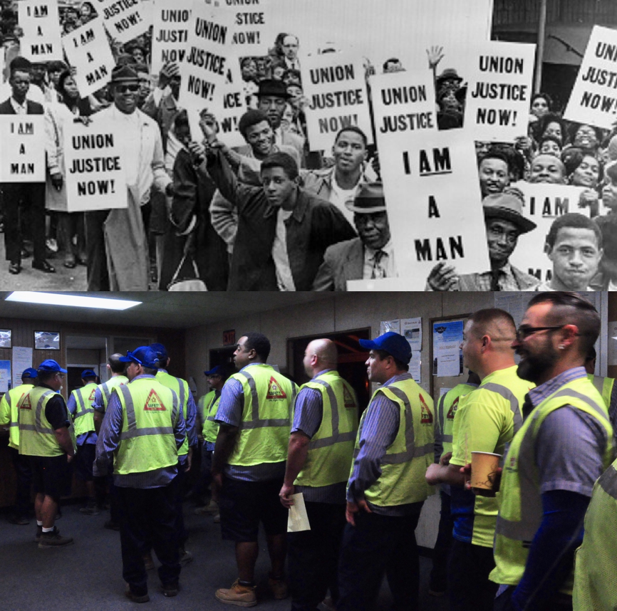 Memphis sanitation workers on strike for union recognition, better pay, and safe work conditions in 1968 (top), and Local 315 sanitation workers at Republic Services waiting in line for dispatch (bottom) in 2017.