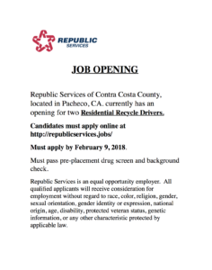 Read MoreApply now at http://republicservices.jobs/ for the Residential Recycle driver position at Republic Services in Pacheco, CA. Deadline is March 23rd!